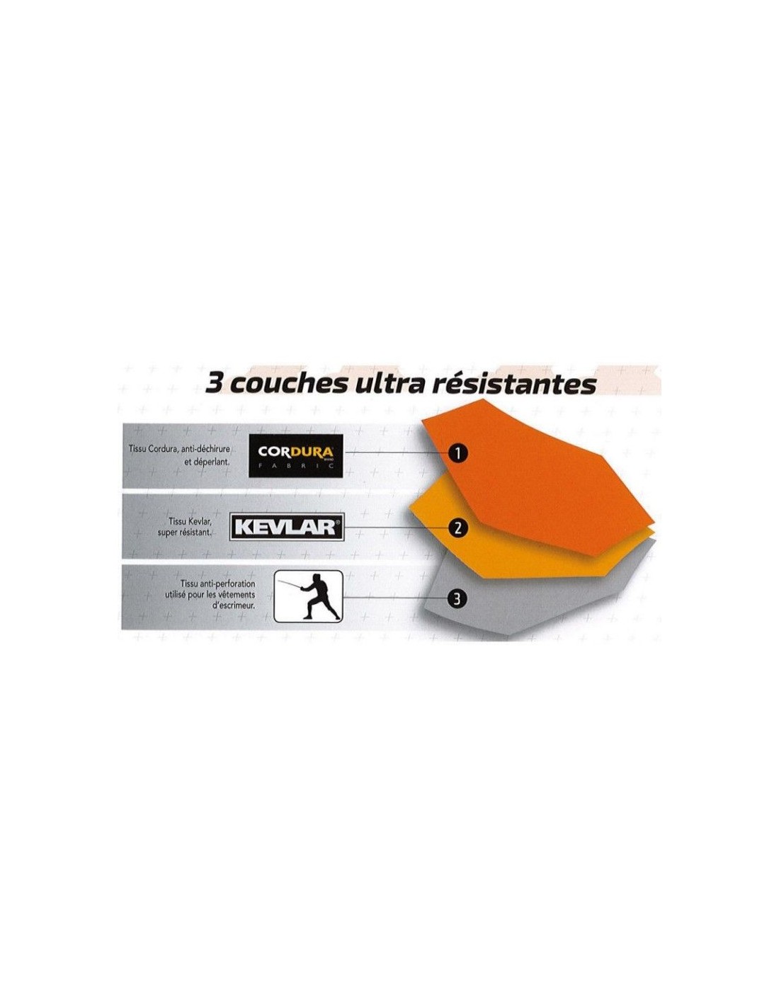 Está compuesto por una capa exterior de cordura® 100% poliéster, en su interior está reforzada con una capa de Kevlar® 100% y una capa de tejido antiperforación utilizada para la ropa de esgrima.