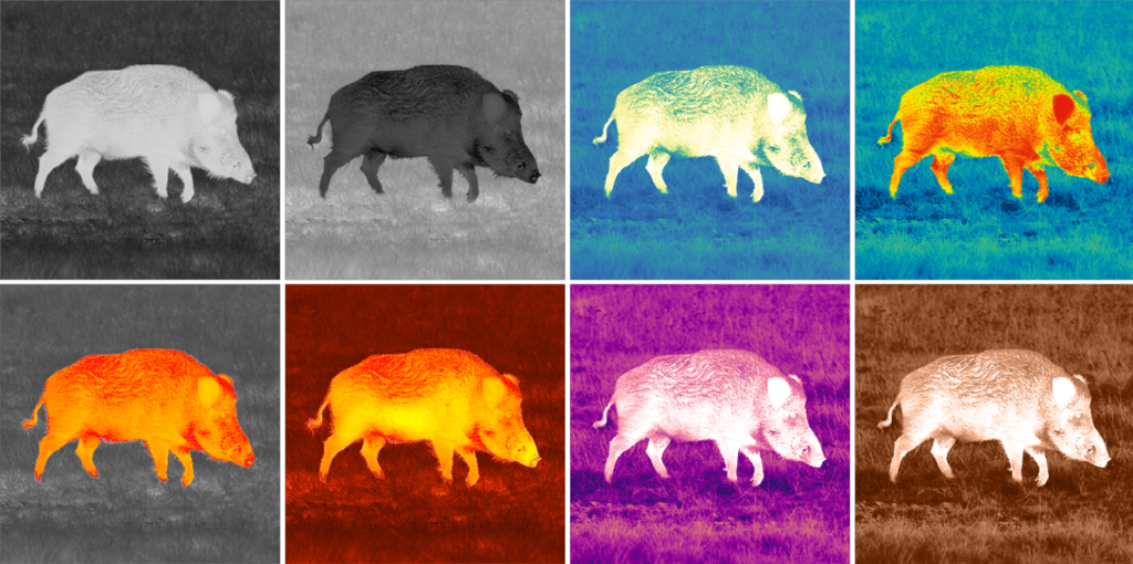 Las ocho paletas de colores mejoran la observación en las condiciones cambiables. Mientras que el modo clásico White Hot es excepcionalmente versátil, el modo Hot Black se utiliza frecuentemente para detectar los animales durante la noche. Red Monochrome permite disminuir o prevenir la entrada de la luz parásita desde el ocular. Sepia, generalmente, mejora la observación a una gran distancia y los modos Red Hot, Rainbow y Ultramarine mejoran la visibilidad de variaciones térmicas de diferentes partes del objetivo. El modo Violet ayuda a identificar el objetivo más rápido.